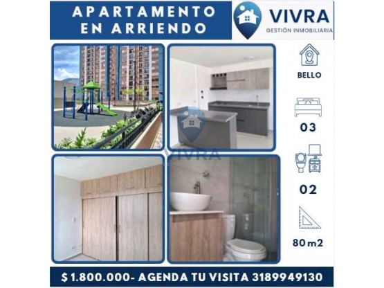 Se arrienda hermoso apartamento de 80 m², ubicado en unidad cerrada en Bello, ideal para quienes buscan seguridad, comodidad y excelente distribución.