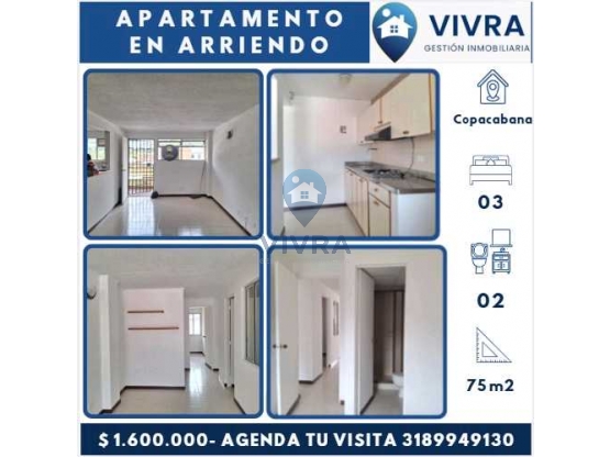 Se arrienda cómodo y acogedor apartamento de 75 m², ubicado en un sector tranquilo y de fácil acceso, cerca de la iglesia de Copacabana, ideal para quienes buscan comodidad y buena ubicación.